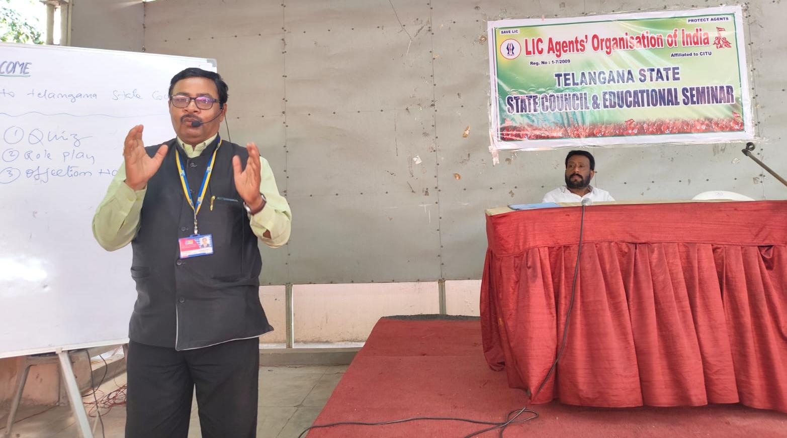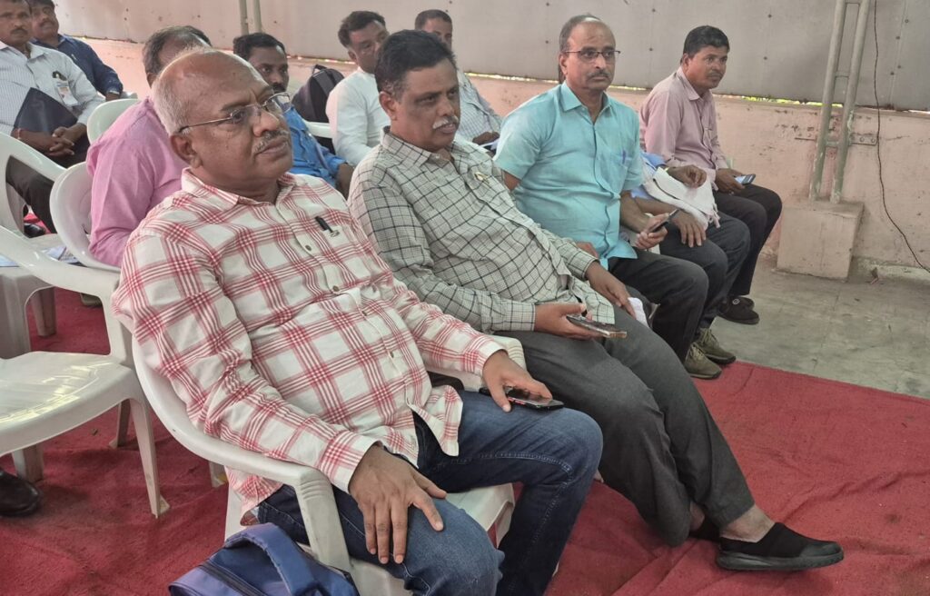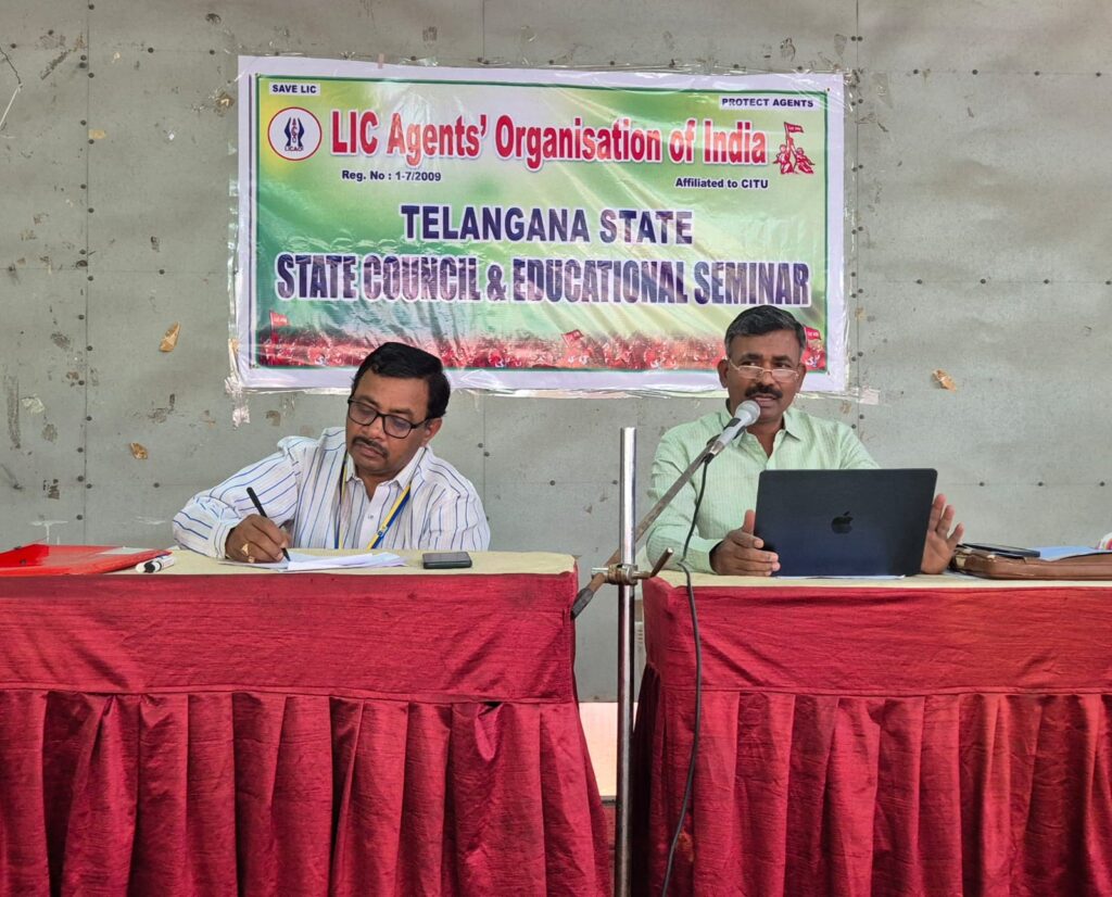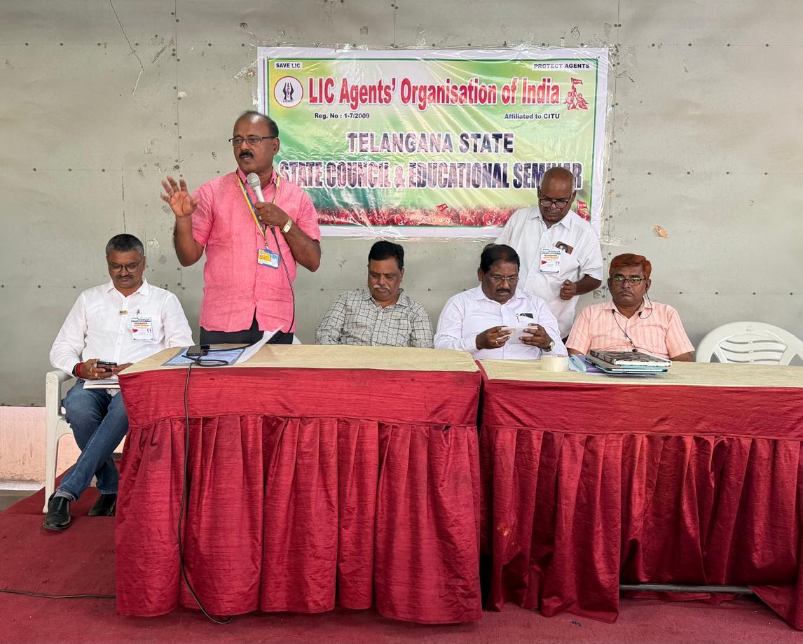 CITU National Secretary Sri K. N. Umeah, AOI All India Working President Com. L. Manjunath, AIIEA-SCZ Jt. Secretary Com. G. Thirupathayya, SCZ General Secretary Com. PLN Rao, President B. Jayarama, CITU Telangana State Secretary Com. J. Venkatesh, B. Venkata Rao, Krishna Reddy, and others conducting classes during the State Study Classes held in Telangana State on the 11th and 12th April, 2026.